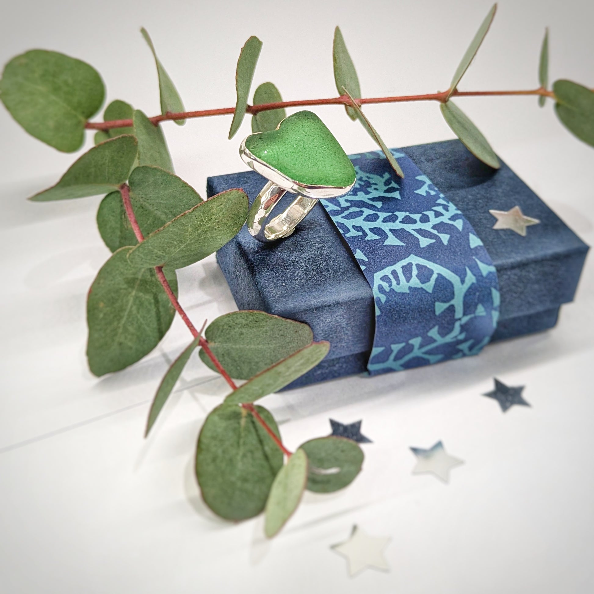 This one of a kind, green, heart shaped sea glass, uniquely shaped by the waves, then set in silver really says it all - jewellery that sparkles, from a maker whose goal is to be Earth friendly. Say NO to fast fashion. Say YES to a handmade little treasure.